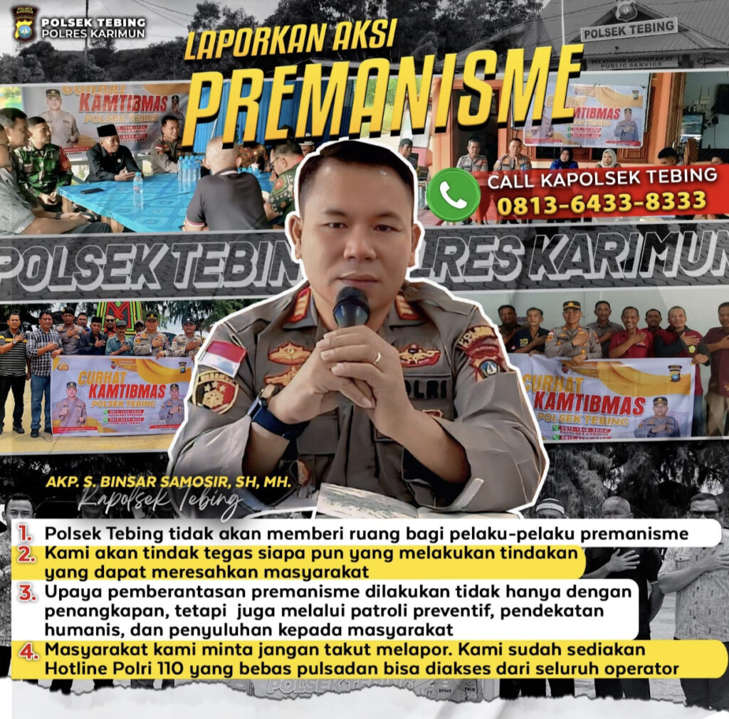 J5NEWSROOM.COM, Karimun – Kapolsek Tebing, Ajun Komisaris Polisi (AKP) S. Binsar Samosir, mengimbau masyarakat untuk tidak ragu melaporkan segala bentuk aksi premanisme yang meresahkan lingkungan. Ia menegaskan bahwa kepolisian siap menindak tegas pelaku premanisme yang mengganggu ketertiban dan kenyamanan warga.