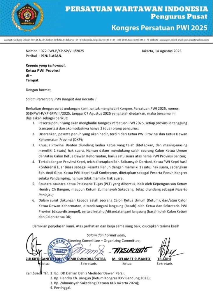 Sehubungan dengan surat undangan kami untuk menghadiri Kongres Persatuan PWI 2025 Nomor: 058/PWI-P/KP-SP/VIII/2025 tanggal 07 Agustus 2025 yang telah diedarkan, bersama ini kami sampaikan penjelasan sebagai berikut:
