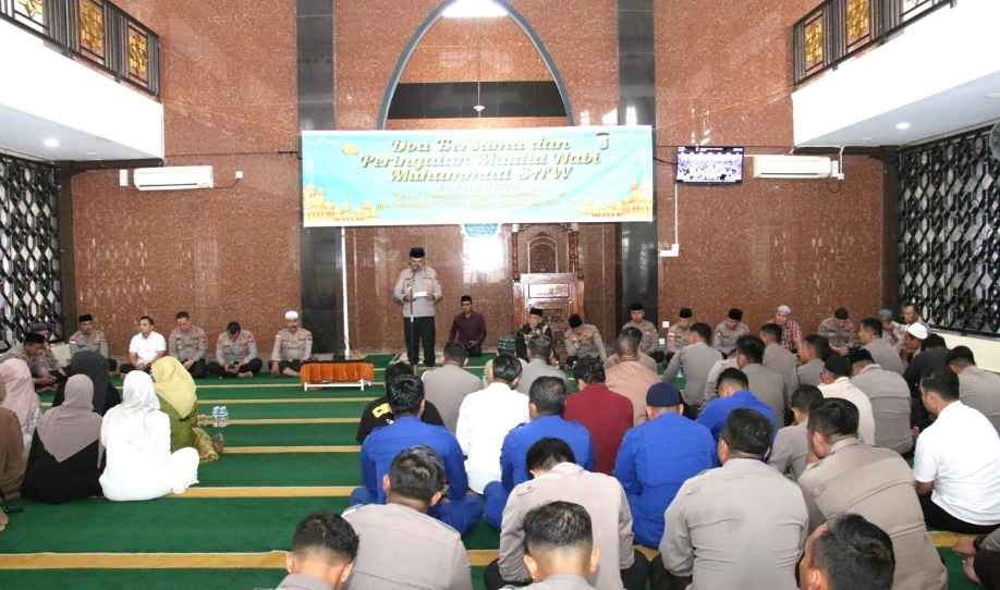 J5NEWSROOM.COM, Batam – Polresta Barelang menggelar doa bersama dan peringatan Maulid Nabi Muhammad SAW 1447 H/2025 M di Masjid Jihadul Mucharam, Kamis (11/9/2025). Acara berlangsung khidmat dan dihadiri jajaran kepolisian beserta keluarga besar Bhayangkari.