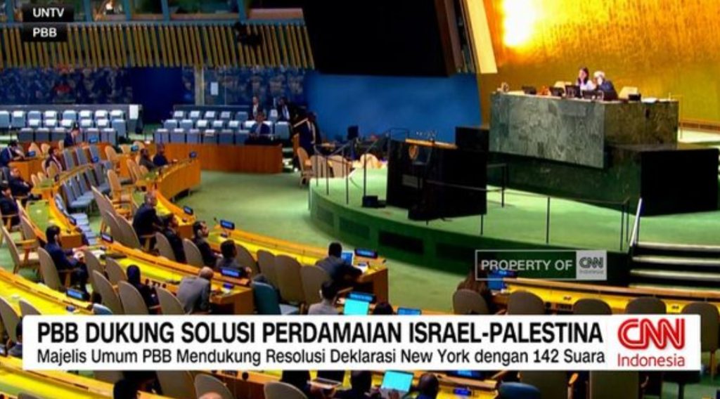 J5NEWSROOM.COM, Majelis Umum Perserikatan Bangsa-Bangsa mengesahkan Deklarasi New York yang berisi dukungan terhadap kemerdekaan Palestina. Sebanyak 142 negara mendukung, 10 negara menolak, dan 12 negara memilih abstain dalam voting tersebut.