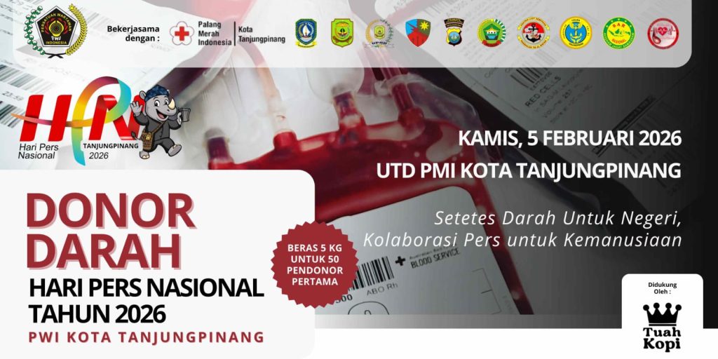 Mengusung tema “Setetes Darah untuk Negeri, Kolaborasi Pers untuk Kemanusiaan”, kegiatan donor darah akan dilaksanakan pada Kamis, 5 Februari 2026, mulai pukul 08.00 WIB hingga selesai, bertempat di UTD PMI Kota Tanjungpinang, Jalan Rumah Sakit Nomor 32.