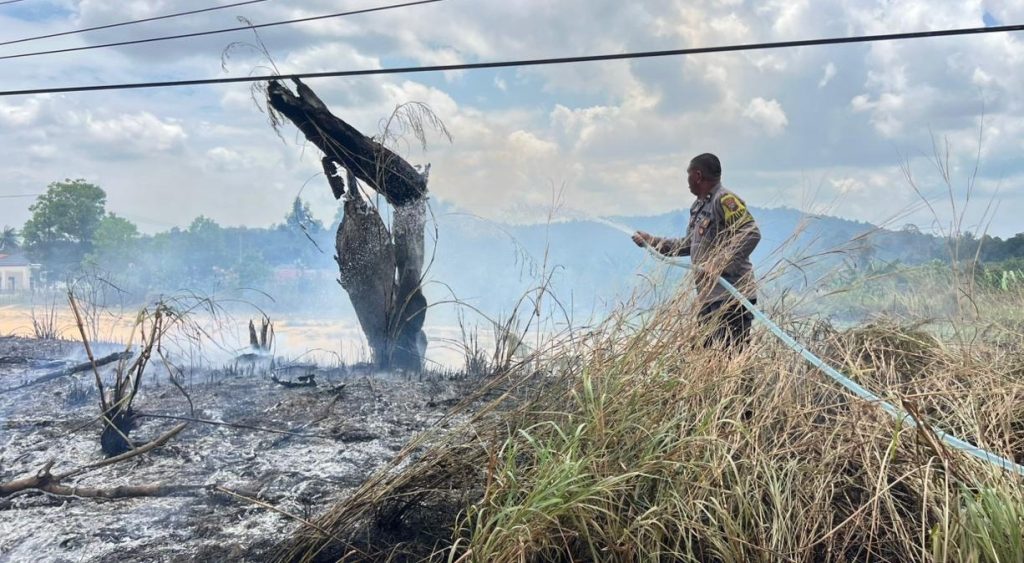 J5NEWSROOM.COM, Bintan – Kebakaran melanda lahan kosong di kawasan Gapura Telaga Biru, Kelurahan Gunung Lengkuas, Kecamatan Bintan Timur, Sabtu (7/3/2026). Warga bersama Bhabinkamtibmas setempat bergotong royong memadamkan api yang sempat menjalar di area tersebut.