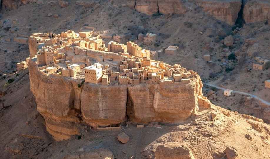 Semua itu tidak terlihat dari jalan raya utama Mukalla-Tarim. Tapi, kalau Anda mau, mobil bisa Anda ajak keluar dari jalan raya. Masuk padang tanah. Offroad. Ke arah satu celah di kejauhan sana. Anda akan sampai di pinggir jurang. Dari bibir jurang itu Anda bisa melongok jauh ke bawah: di sanalah kotanya.