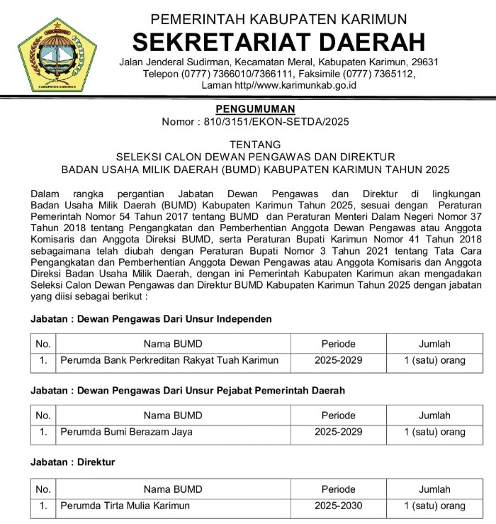 Pemkab Karimun Kembali Buka Seleksi Calon Dewan Pengawas dan Direktur BUMD Kabupaten Karimun Redaksi J5 7 August, 20257 August, 2025
